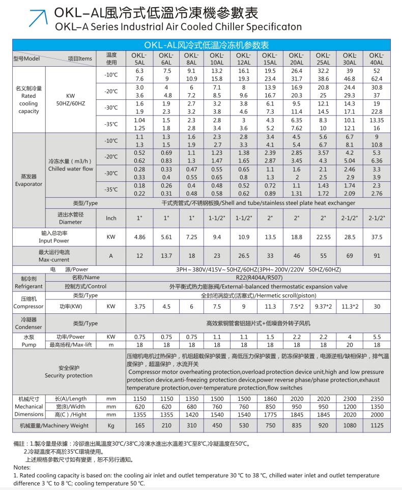 歐科隆牌風冷式冷水機之制冷心臟采用全密封低噪音,振動小,高效能省電進口名牌壓縮機,電器控制全部采用進口名牌原件,熱交換器采用殼管式冷凝器,換熱效能高,便于清洗保養(yǎng)